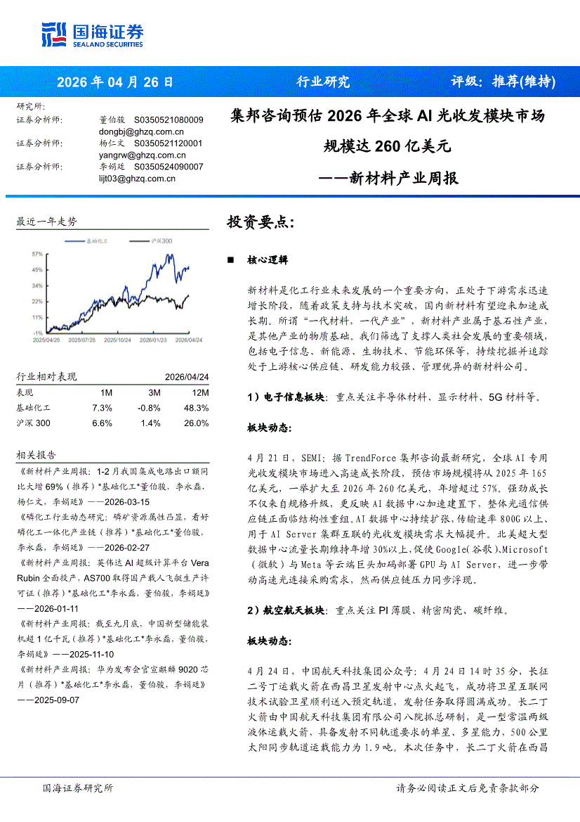 基础化工行业:国海证券-基础化工行业新材料产业周报:集邦咨询预估2026年全球AI光收发模块市场规模达260亿美元-260426