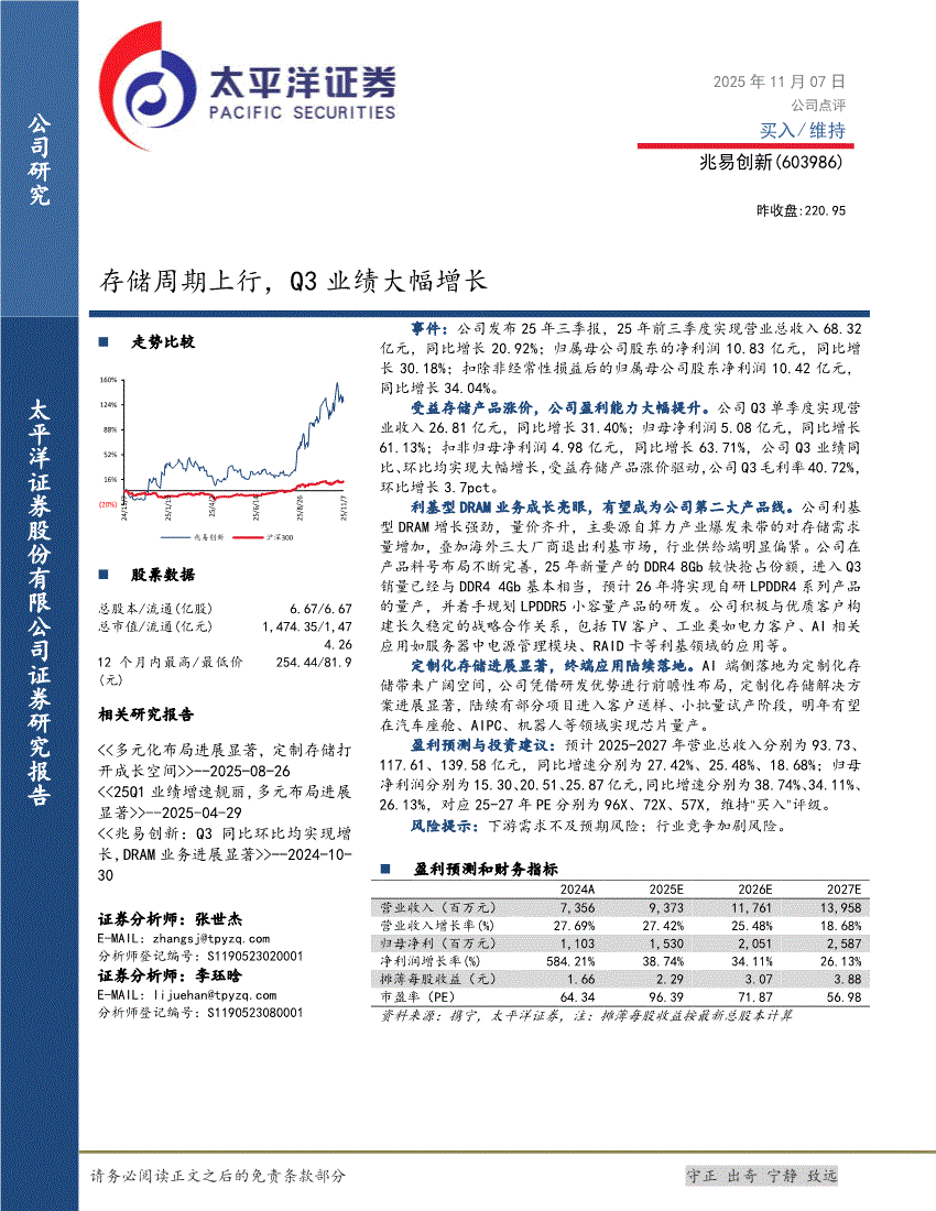 兆易创新:太平洋证券-兆易创新-603986-存储周期上行,Q3业绩大幅增长-251107