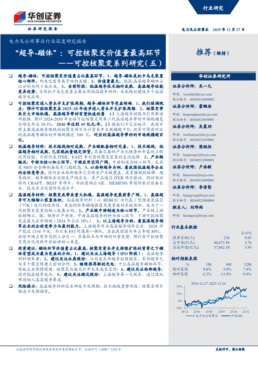 电力及公用事业行业:华创证券-电力及公用事业行业深度研究报告:可控核聚变系列研究(五),“超导~磁体”,可控核聚变价值量最高环节-251227