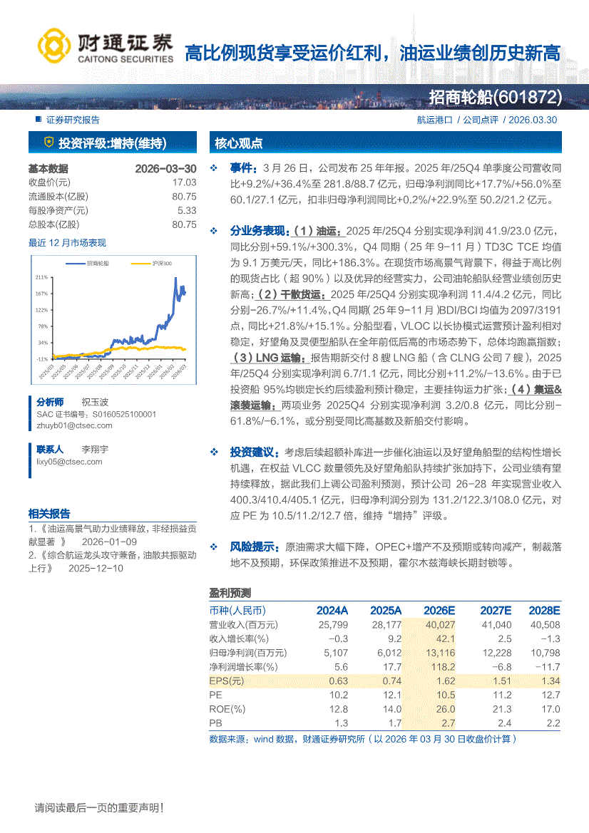 招商轮船:财通证券-招商轮船-601872-高比例现货享受运价红利,油运业绩创历史新高-260330