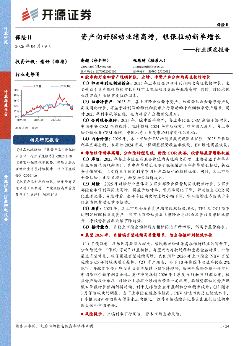保险行业:开源证券-保险行业深度报告:资产向好驱动业绩高增,银保拉动新单增长-260409