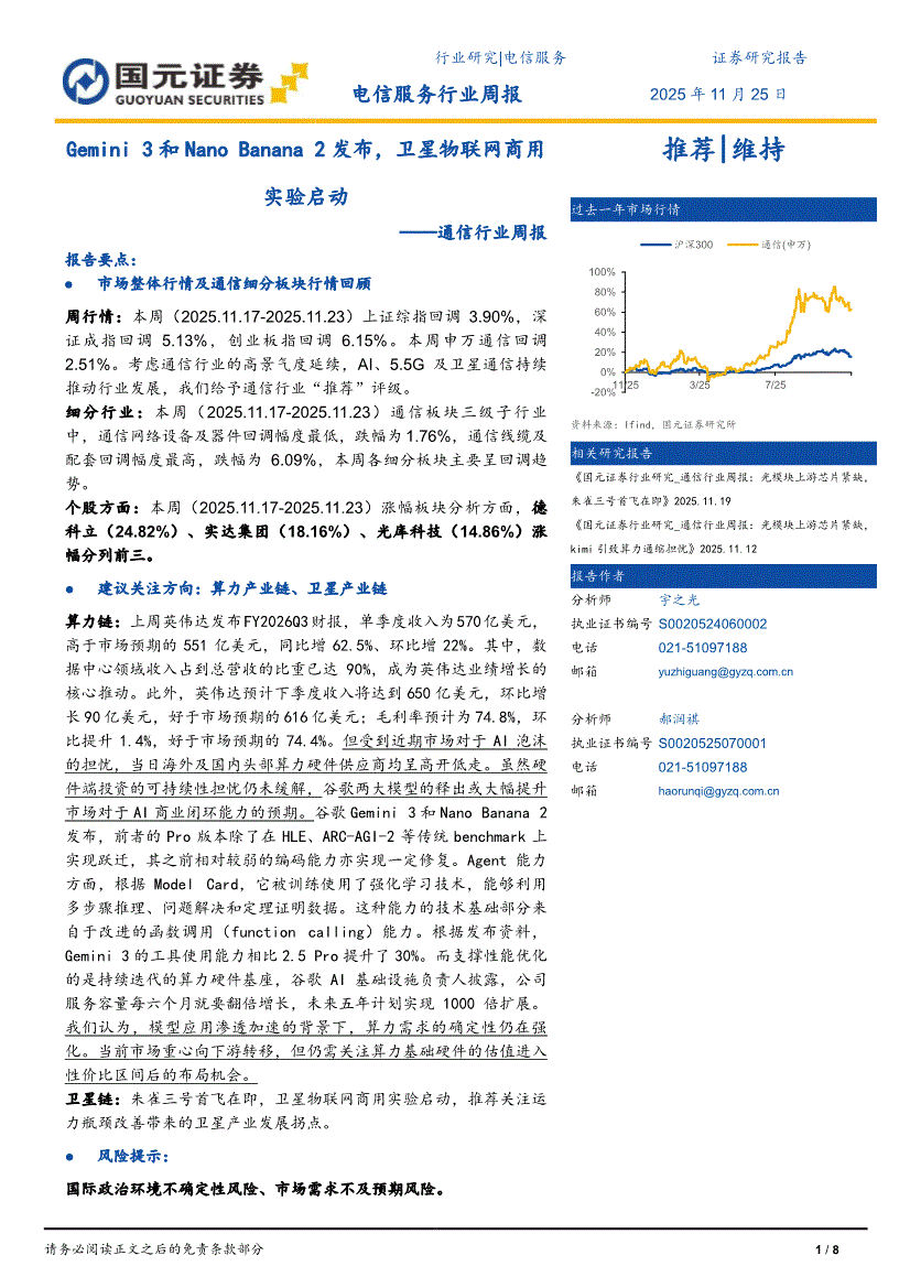 通信行业:国元证券-通信行业周报:Gemini 3和Nano Banana 2发布,卫星物联网商用实验启动-251125