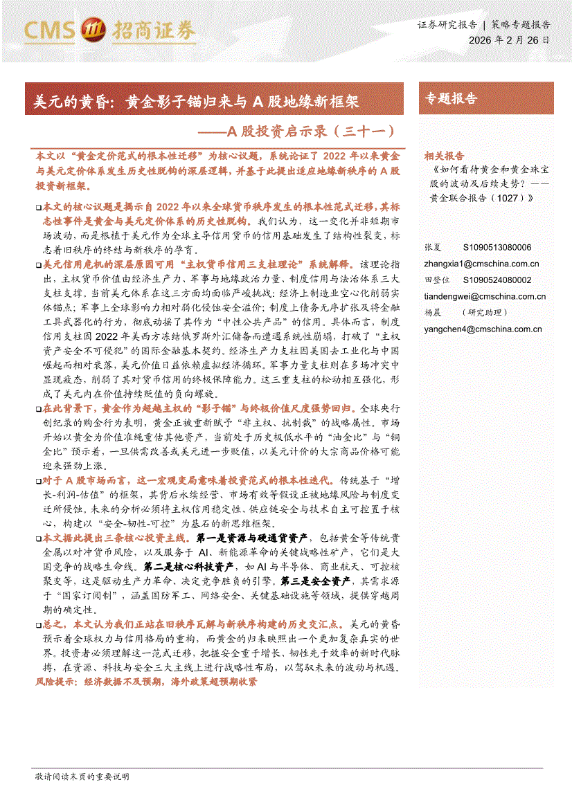 招商证券-A股投资启示录(三十一):美元的黄昏,黄金的影子锚归来与A股地缘新框架-260226
