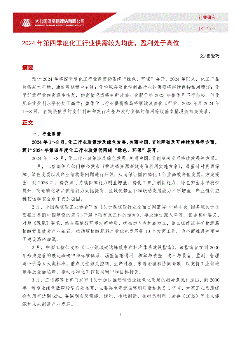 化工行业:大公国际-化工行业:2024年第四季度化工行业供需较为均衡,盈利处于高位-240918