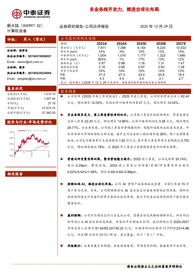 新大陆:中泰证券-新大陆-000997-多业务线齐发力,推进全球化布局-251229