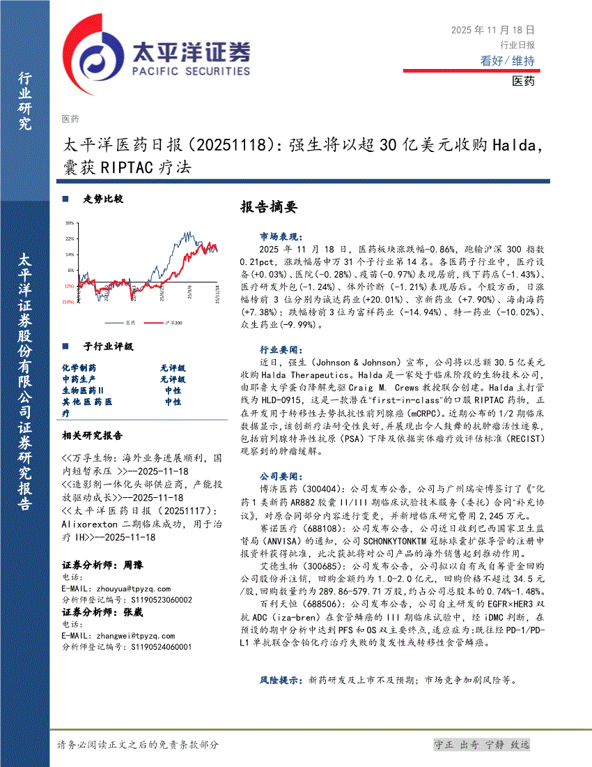 医药行业:太平洋证券-医药行业日报:强生将以超30亿美元收购Halda,囊获RIPTAC疗法-251118