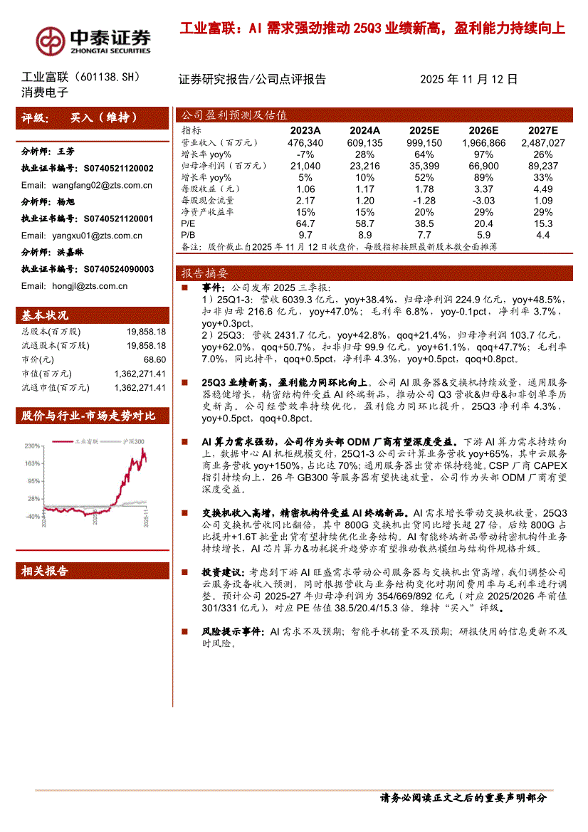 工业富联:中泰证券-工业富联-601138-AI需求强劲推动25Q3业绩新高,盈利能力持续向上-251112