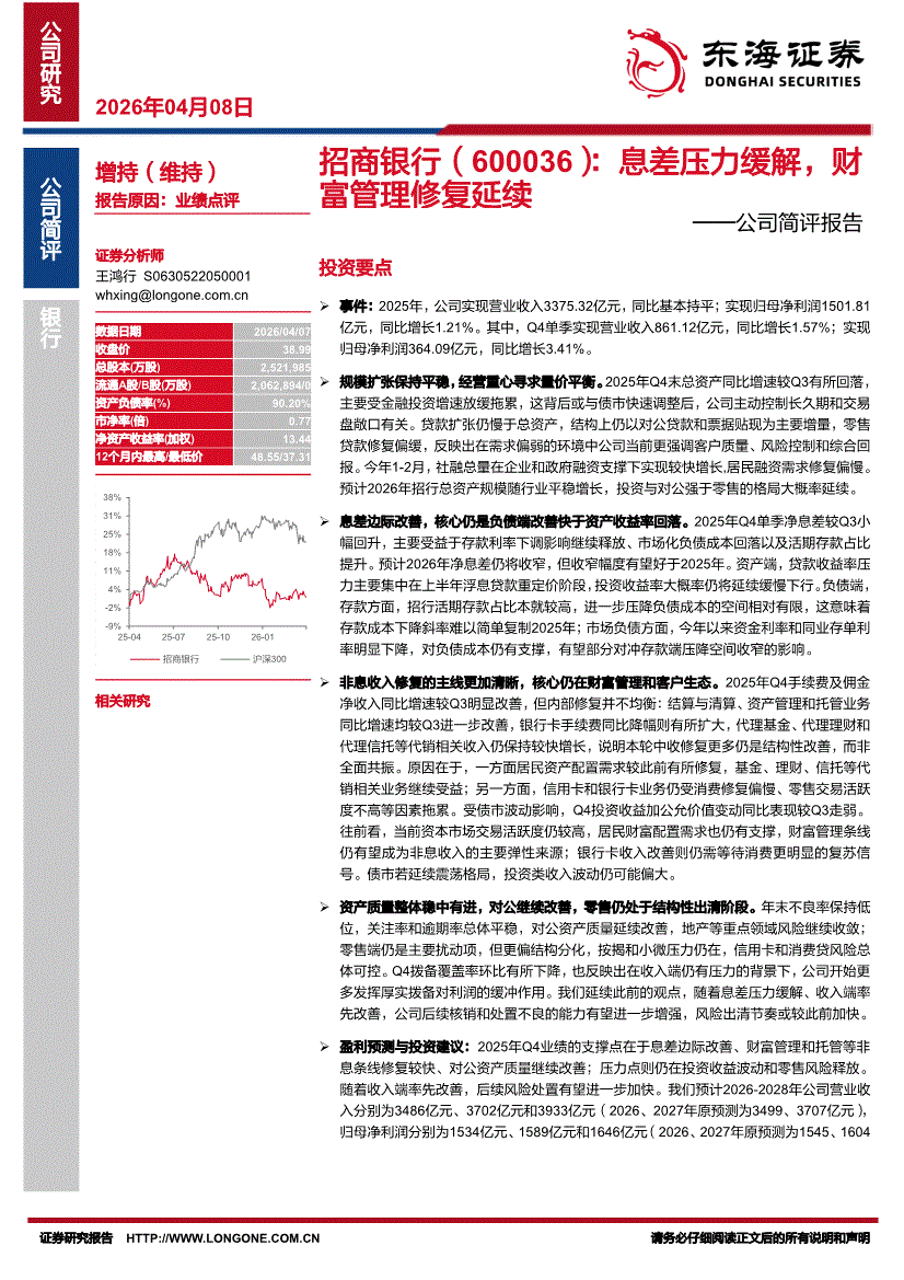 招商银行:东海证券-招商银行-600036-公司简评报告:息差压力缓解,财富管理修复延续-260408