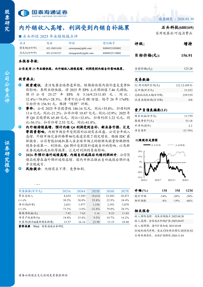 石头科技:国泰海通证券-石头科技-688169-2025年业绩快报点评:内外销收入高增,利润受到内销自补拖累-260330