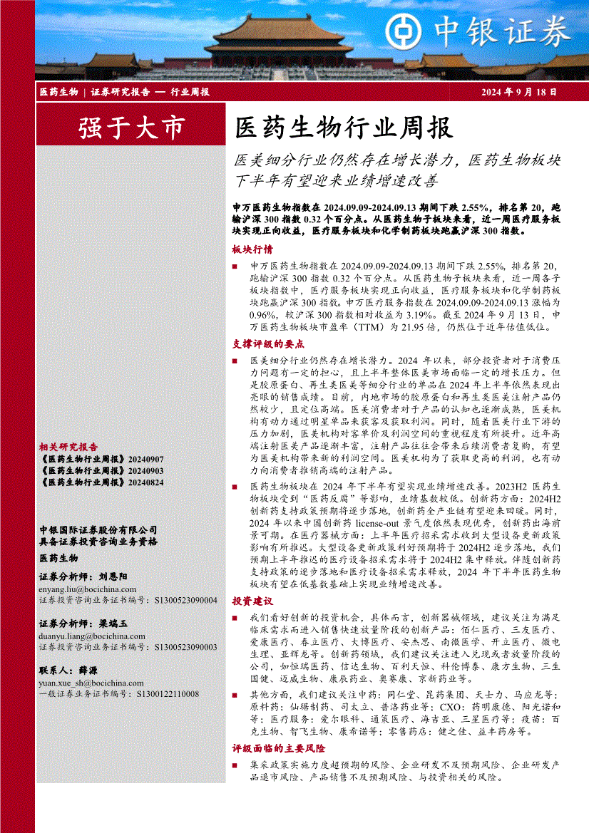 医药生物行业:中银国际-医药生物行业周报:医美细分行业仍然存在增长潜力,医药生物板块下半年有望迎来业绩增速改善-240918