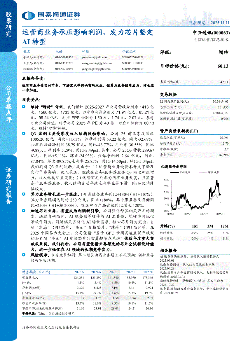 中兴通讯:国泰海通证券-中兴通讯-000063-运营商业务承压影响利润,发力芯片坚定AI转型-251111