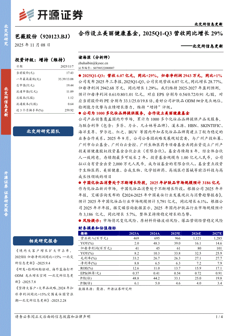 芭薇股份:开源证券-芭薇股份-920123-北交所信息更新:合作设立美丽健康基金,2025Q1~Q3营收同比增长29%-251108