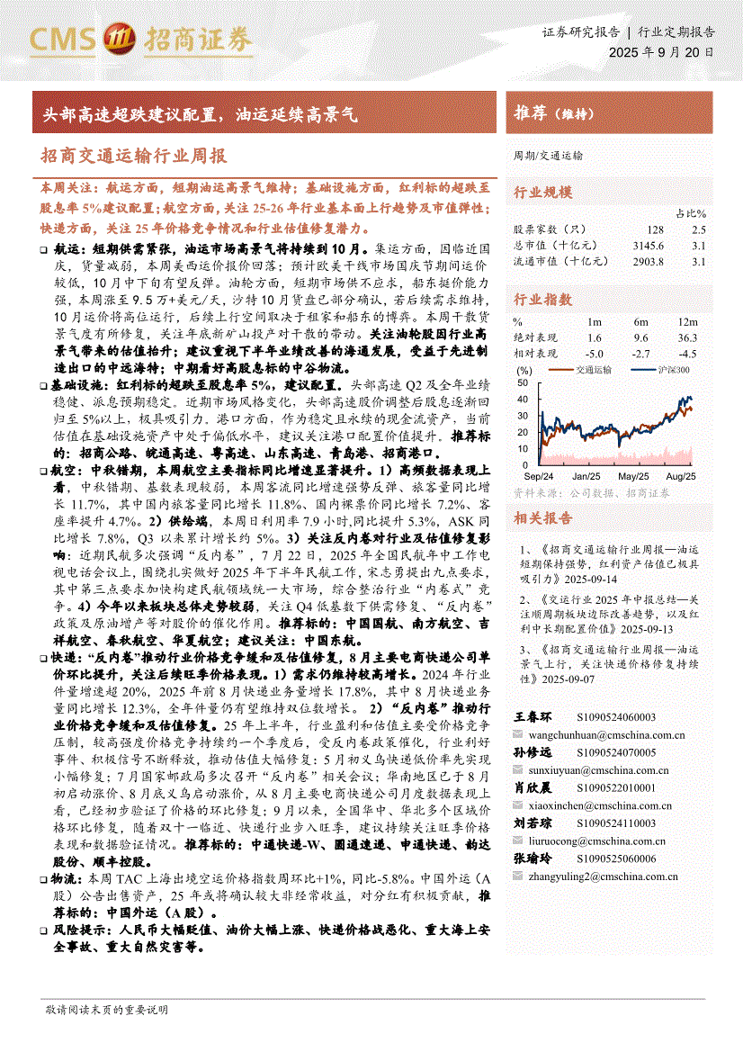 交通运输行业:招商证券-交通运输行业周报:头部高速超跌建议配置,油运延续高景气-250920