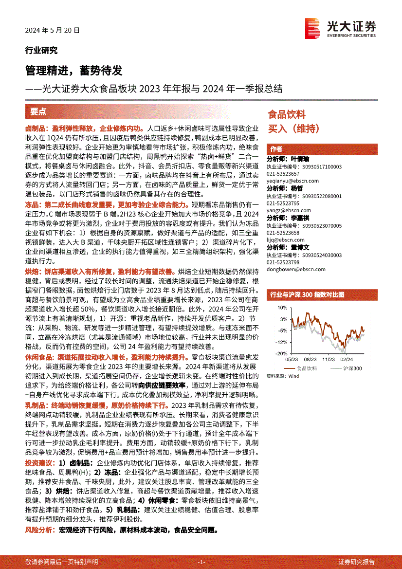 食品饮料行业:光大证券-食品饮料行业大众食品板块2023年年报与2024年一季报总结:管理精进,蓄势待发-240520