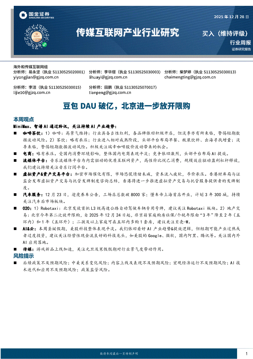 传媒互联网产业行业:国金证券-传媒互联网产业行业周报:豆包DAU破亿,北京进一步放开限购-251228
