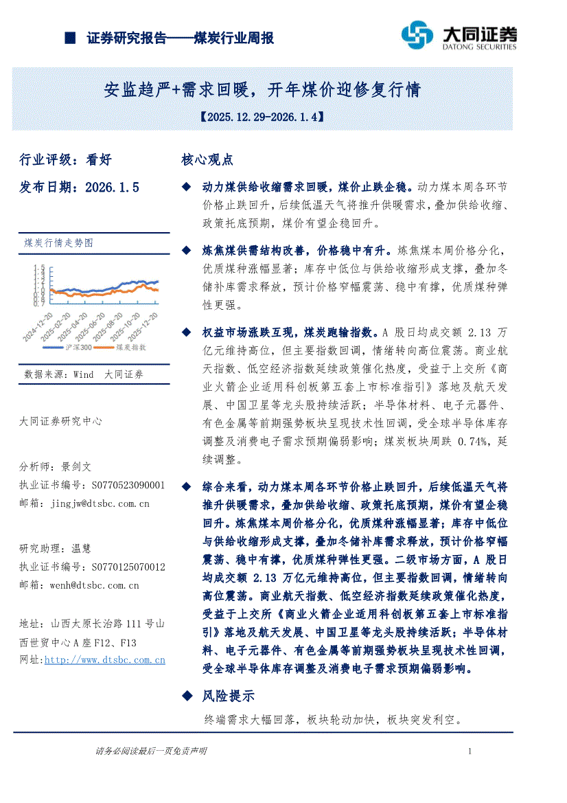 煤炭行业:大同证券-煤炭行业周报:安监趋严+需求回暖,开年煤价迎修复行情-260105