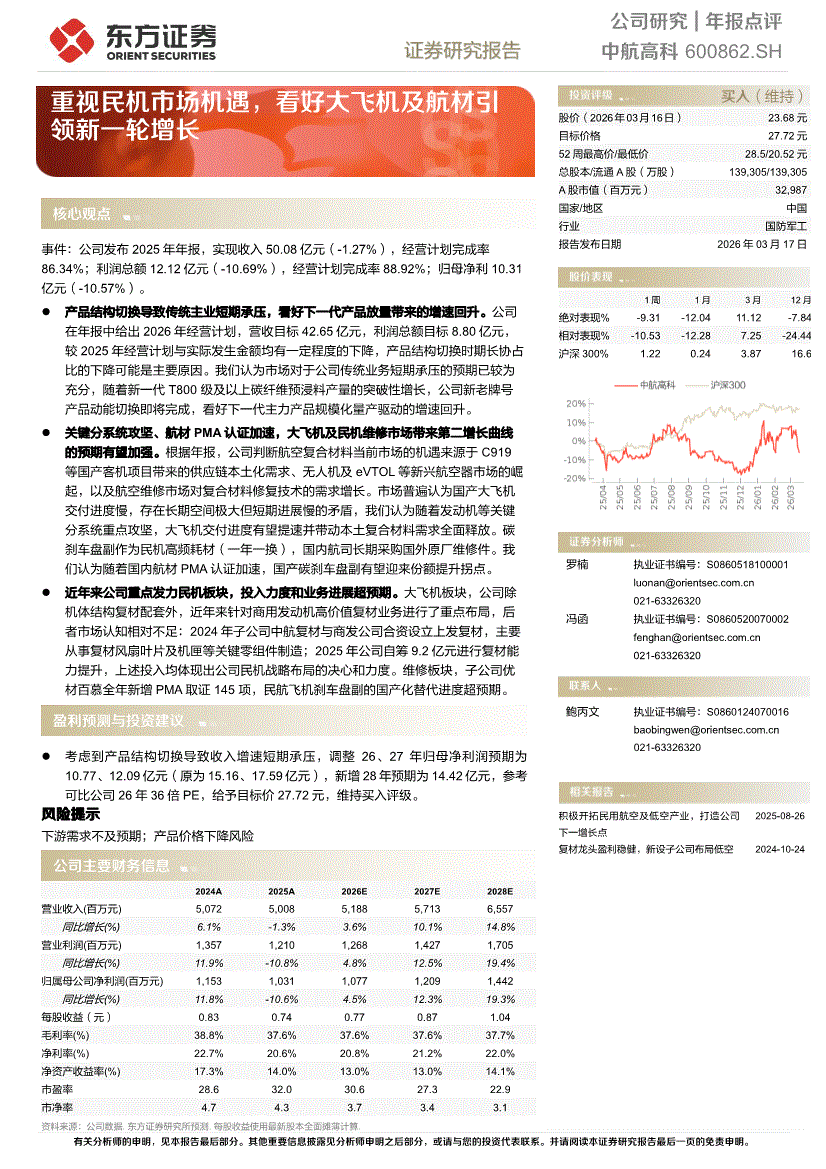东方证券-中航高科-600862-重视民机市场机遇,看好大飞机及航材引领新一轮增长-260317