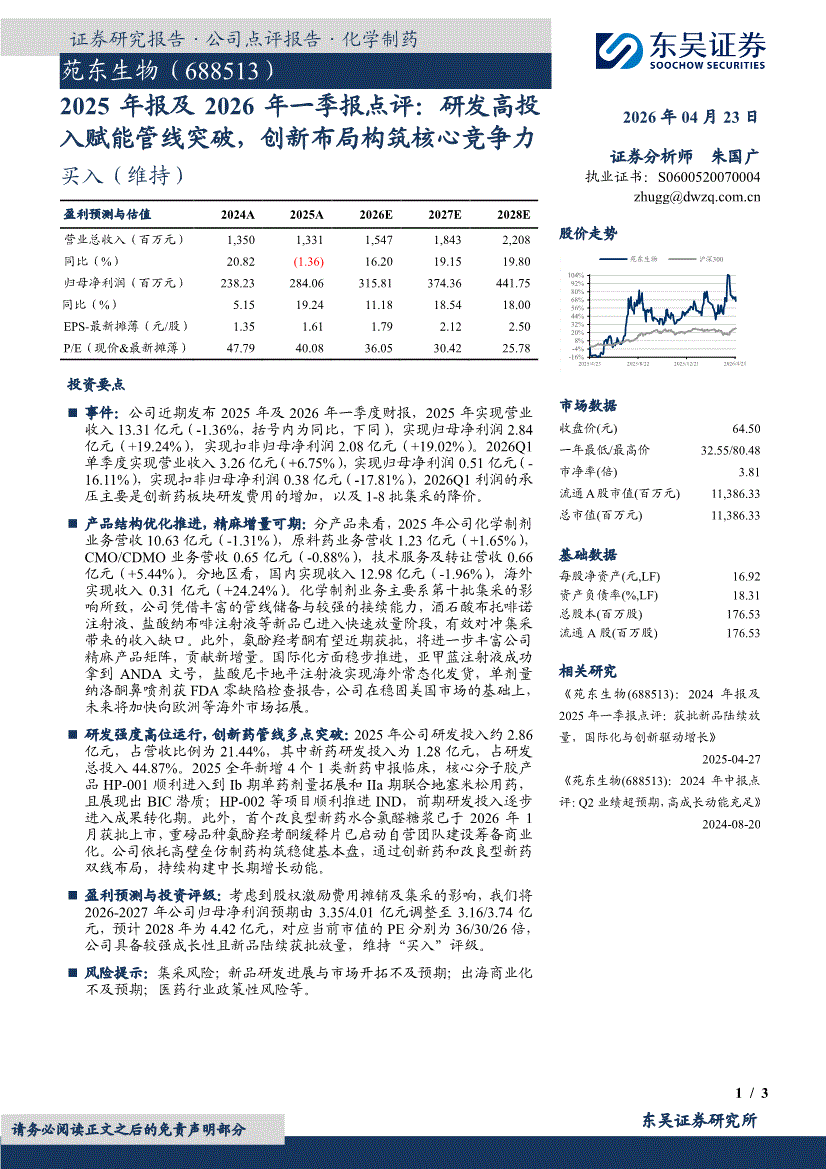 苑东生物:东吴证券-苑东生物-688513-2025年报及2026年一季报点评:研发高投入赋能管线突破,创新布局构筑核心竞争力-260423