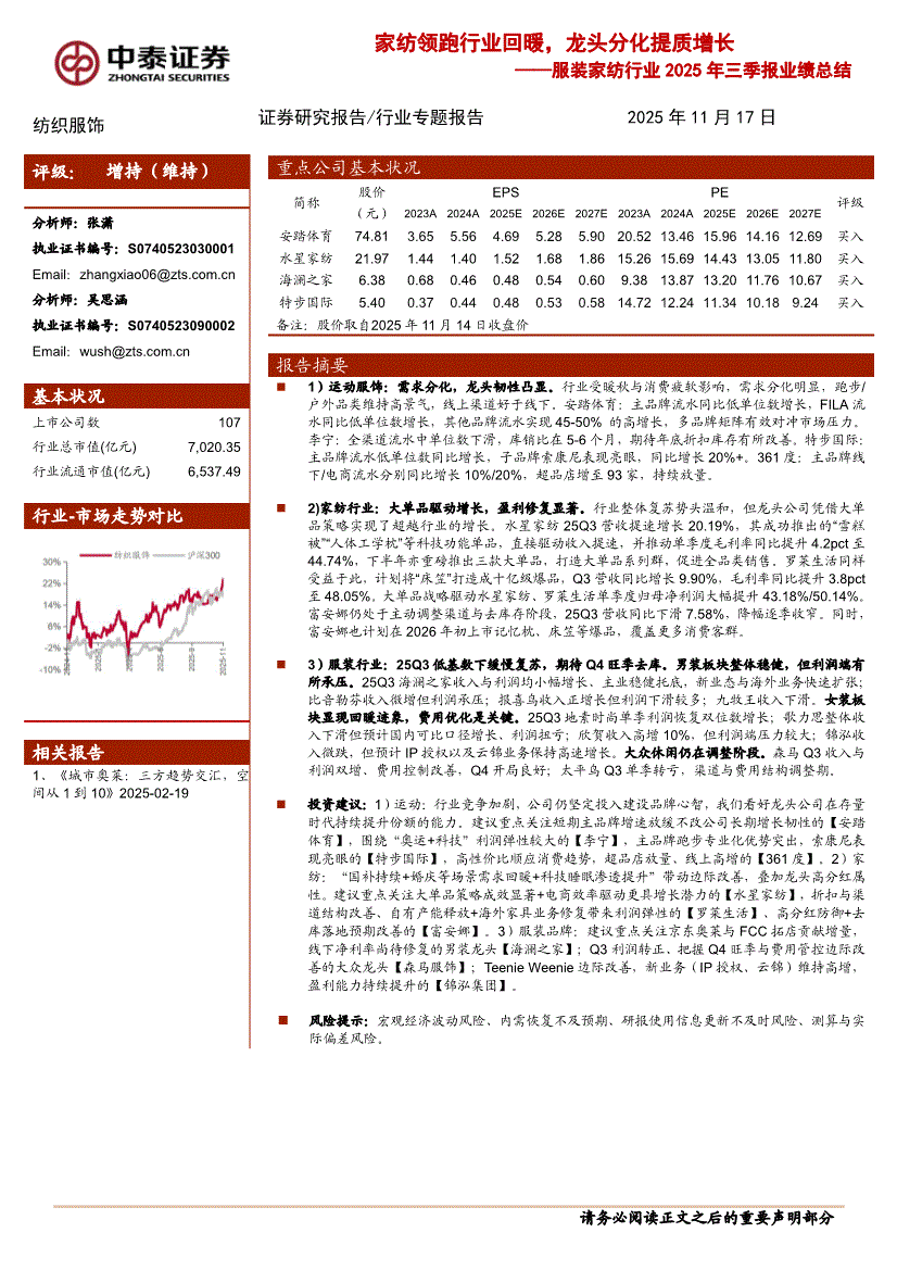 服装家纺行业:中泰证券-服装家纺行业2025年三季报业绩总结:家纺领跑行业回暖,龙头分化提质增长-251117