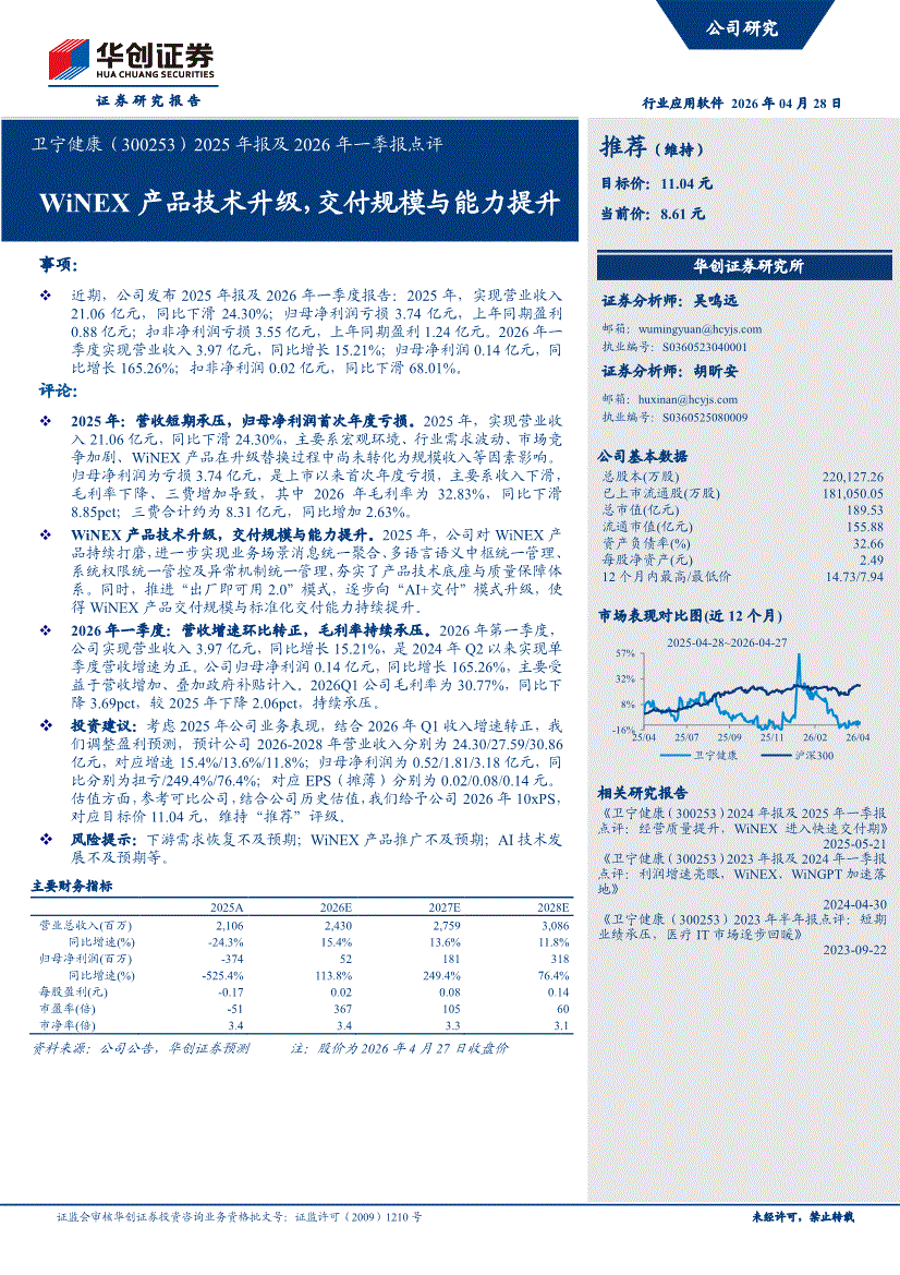 卫宁健康:华创证券-卫宁健康-300253-2025年报及2026年一季报点评:WiNEX产品技术升级,交付规模与能力提升-260428