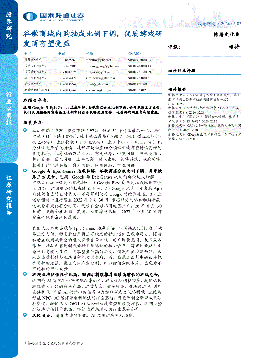 传播文化行业:国泰海通证券-传播文化行业:谷歌商城内购抽成比例下调,优质游戏研发商有望受益-260307