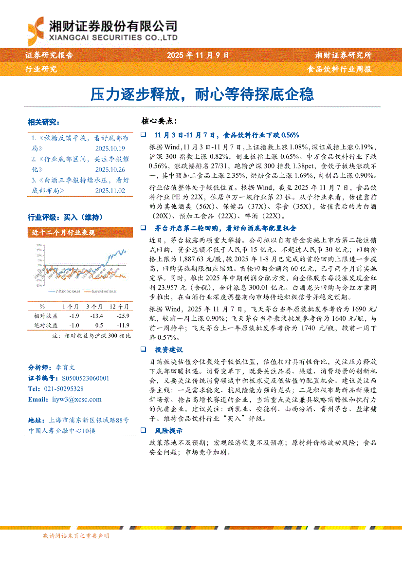 食品饮料行业:湘财证券-食品饮料行业周报:压力逐步释放,耐心等待探底企稳-251109