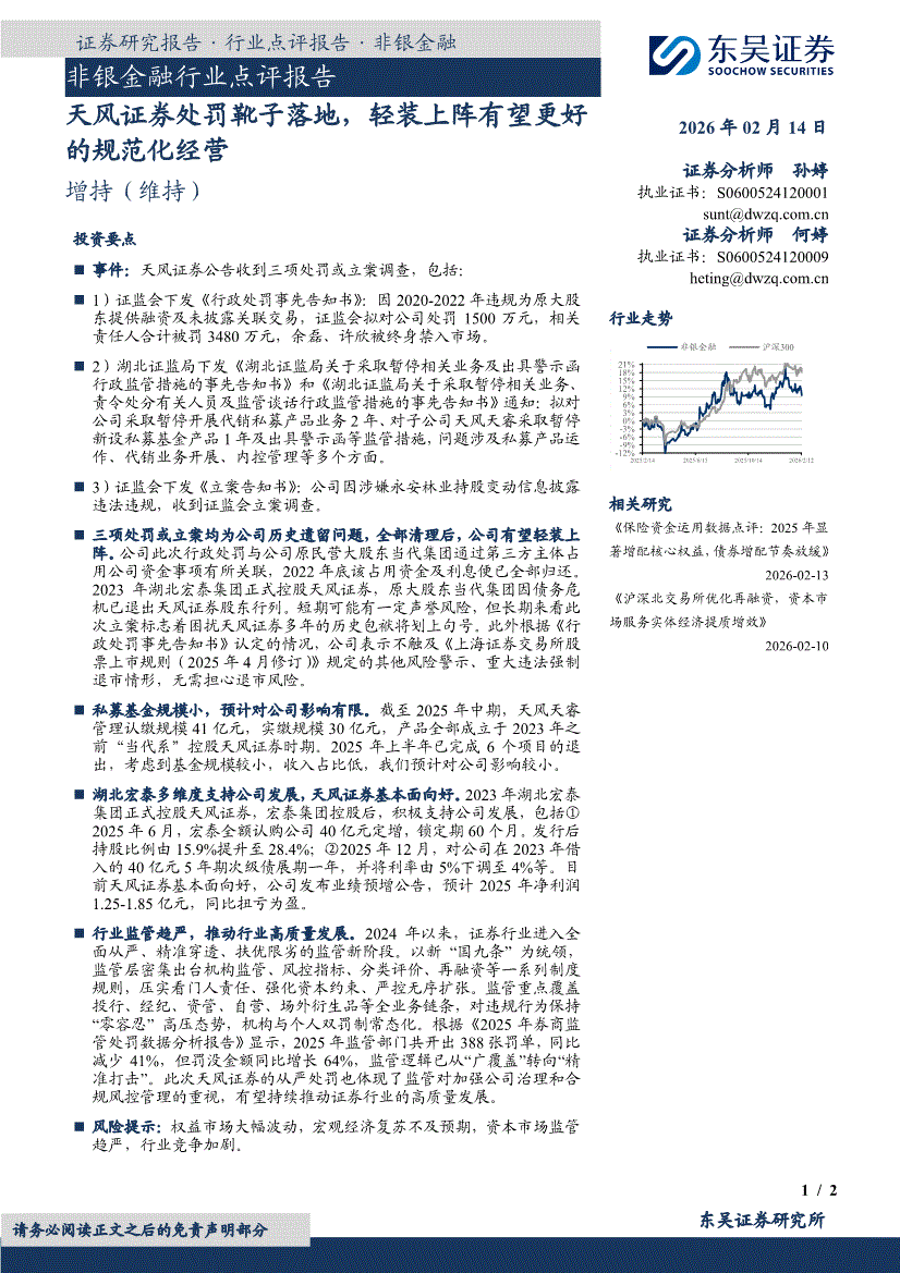 非银金融行业:东吴证券-非银金融行业点评报告:天风证券处罚靴子落地,轻装上阵有望更好的规范化经营-260214