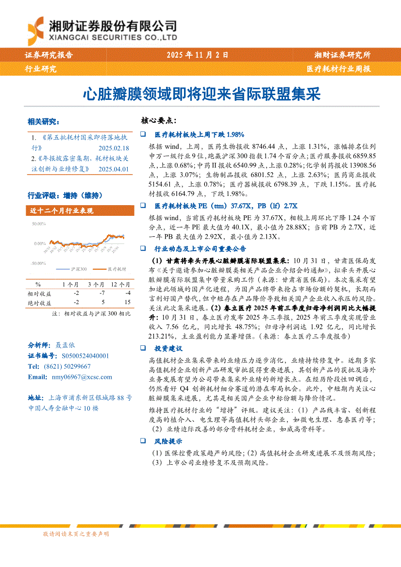 医疗耗材行业:湘财证券-医疗耗材行业周报:心脏瓣膜领域即将迎来省际联盟集采-251102