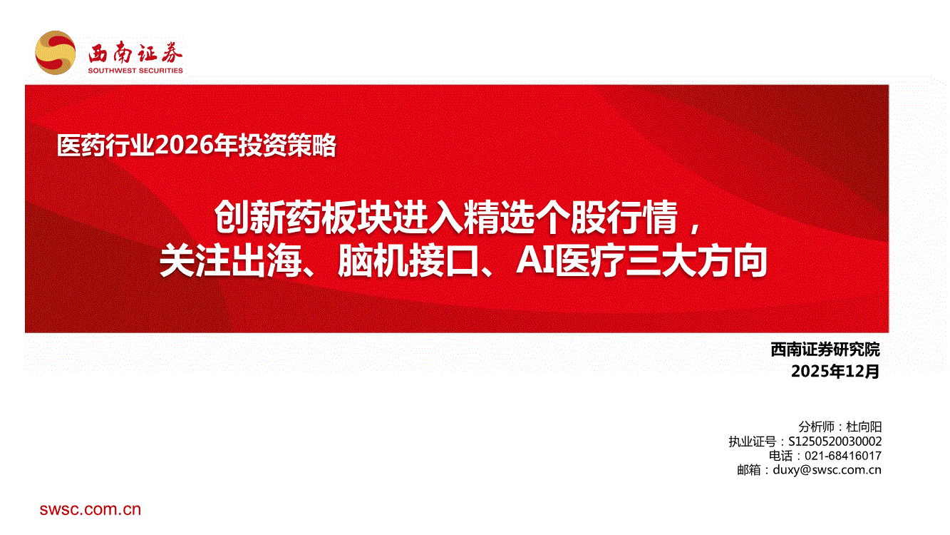 医药行业:西南证券-医药行业2026年投资策略:创新药板块进入精选个股行情,关注出海、脑机接口、AI医疗三大方向-251230