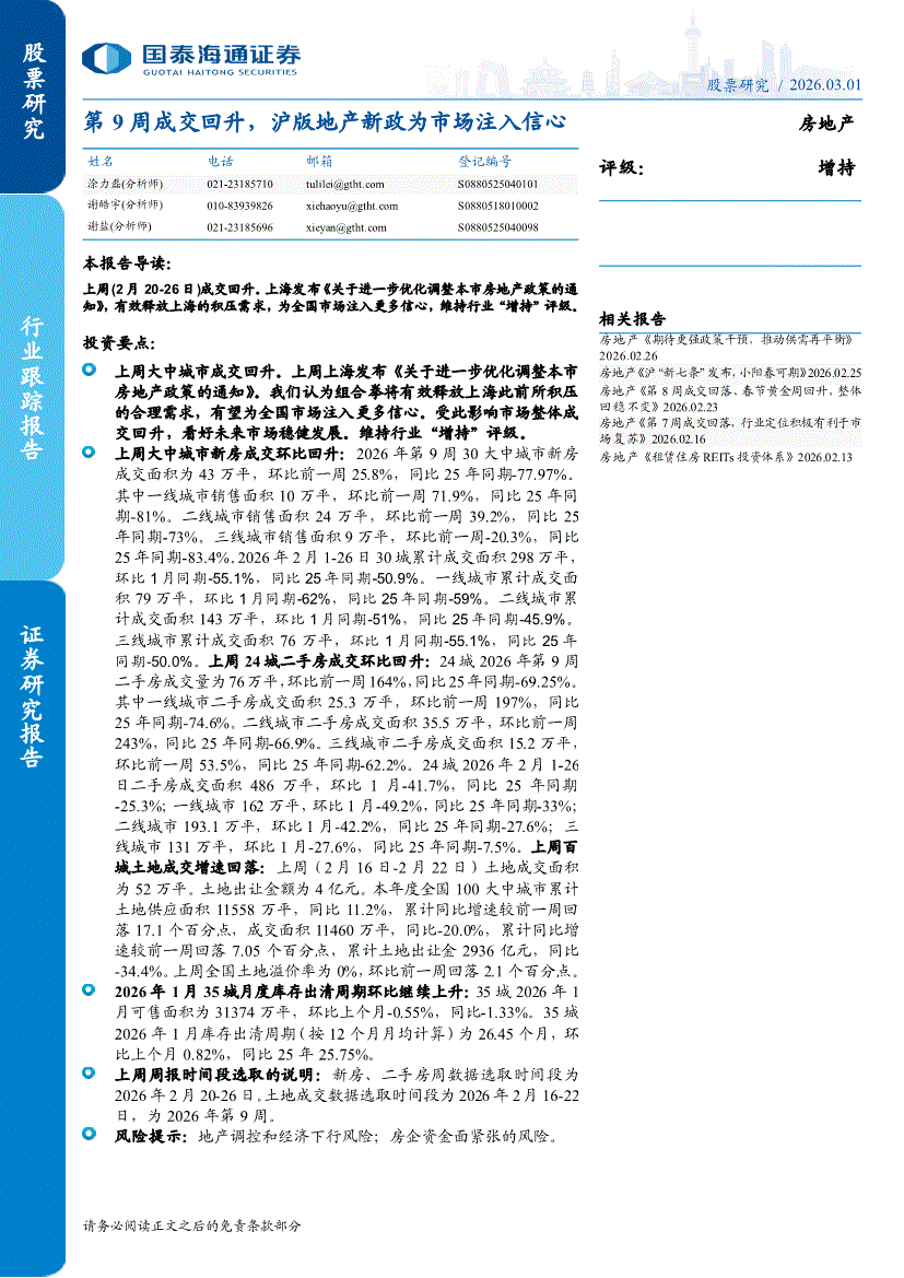 房地产行业:国泰海通证券-房地产行业:第9周成交回升,沪版地产新政为市场注入信心-260301