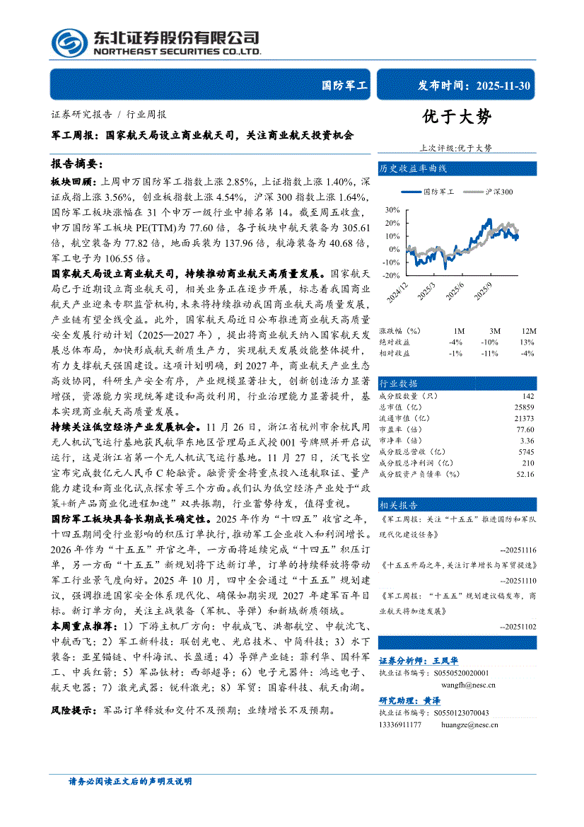国防军工行业:东北证券-军工行业周报:国家航天局设立商业航天司,关注商业航天投资机会-251130