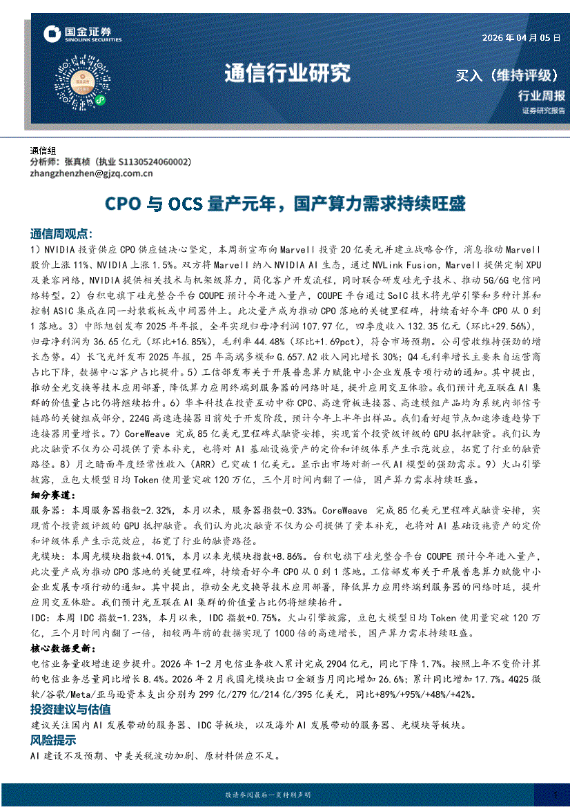 通信行业:国金证券-通信行业周报:CPO与OCS量产元年,国产算力需求持续旺盛-260405