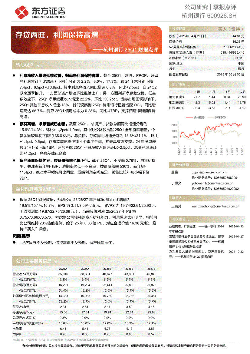 杭州银行:东方证券-杭州银行-600926-25Q1财报点评:存贷两旺,利润保持高增-250505