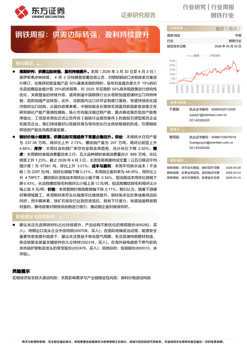 钢铁行业:东方证券-钢铁行业周报:供需边际转强,盈利持续提升-260405