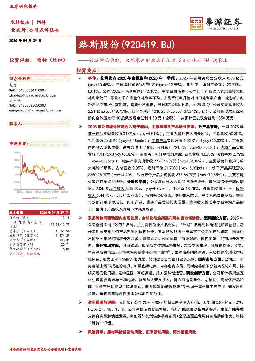 路斯股份:华源证券-路斯股份-920419-营收增长稳健,柬埔寨产能爬坡和汇兑损失致使利润短期承压-260429