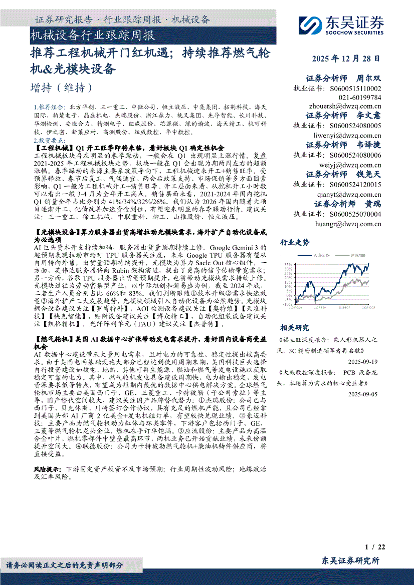 机械设备行业:东吴证券-机械设备行业跟踪周报:推荐工程机械开门红机遇;持续推荐燃气轮机&光模块设备-251228