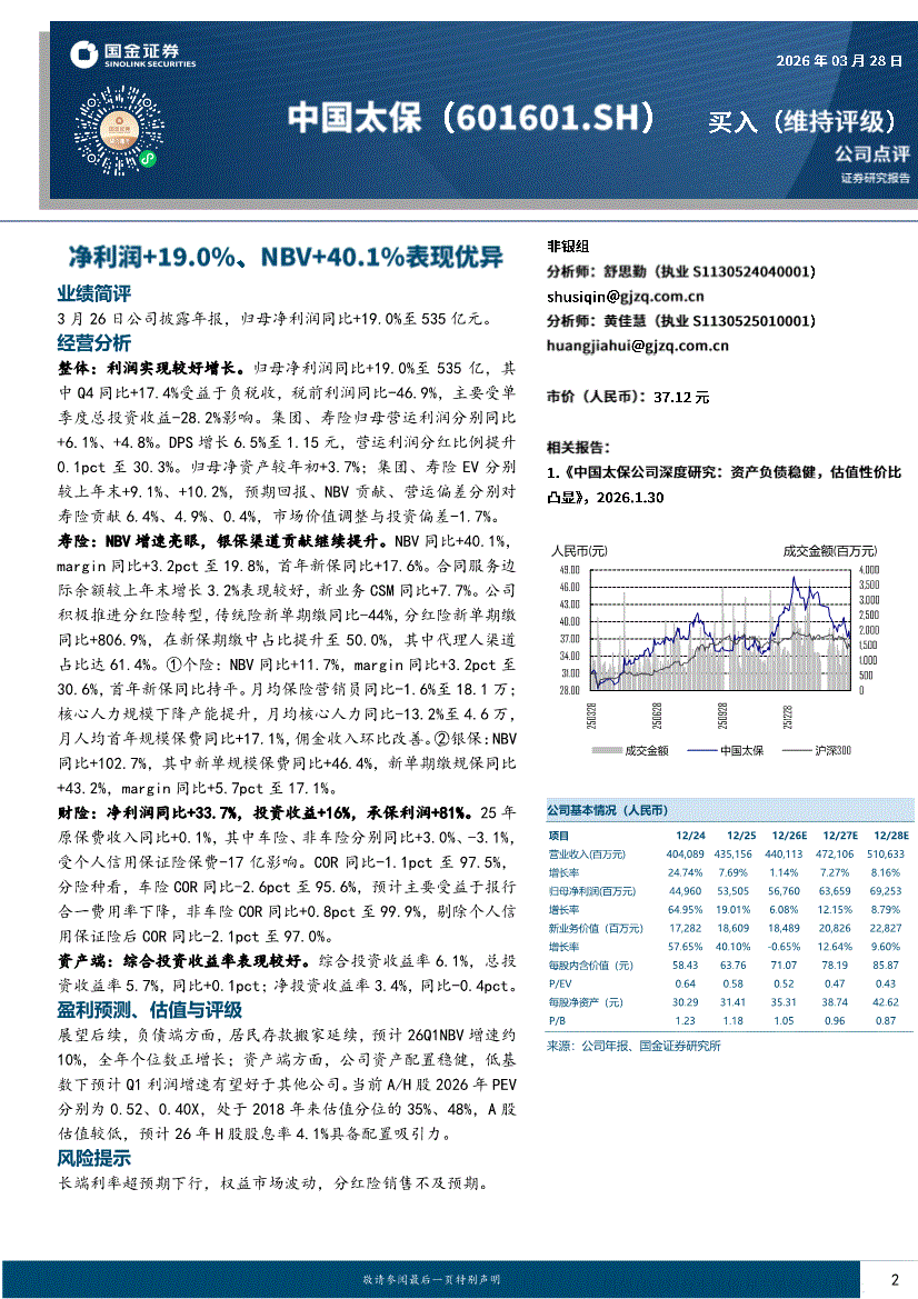 中国太保:国金证券-中国太保-601601-净利润+19.0%、NBV+40.1%表现优异-260328