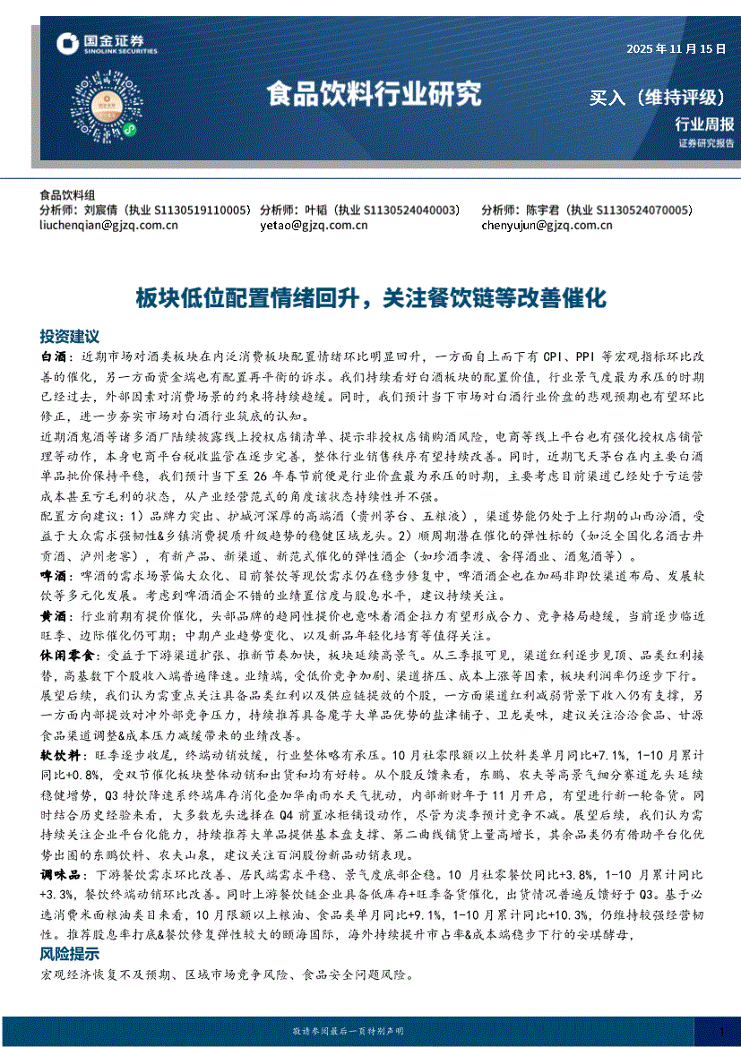 食品饮料行业:国金证券-食品饮料行业周报:板块低位配置情绪回升,关注餐饮链等改善催化-251115