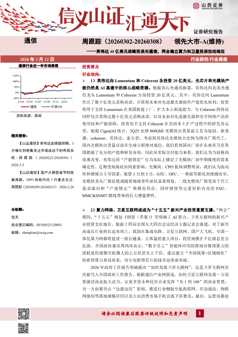 通信行业:山西证券-通信行业周跟踪:英伟达40亿美元战略投资光通信,两会确立算力和卫星投资拉动地位-260312