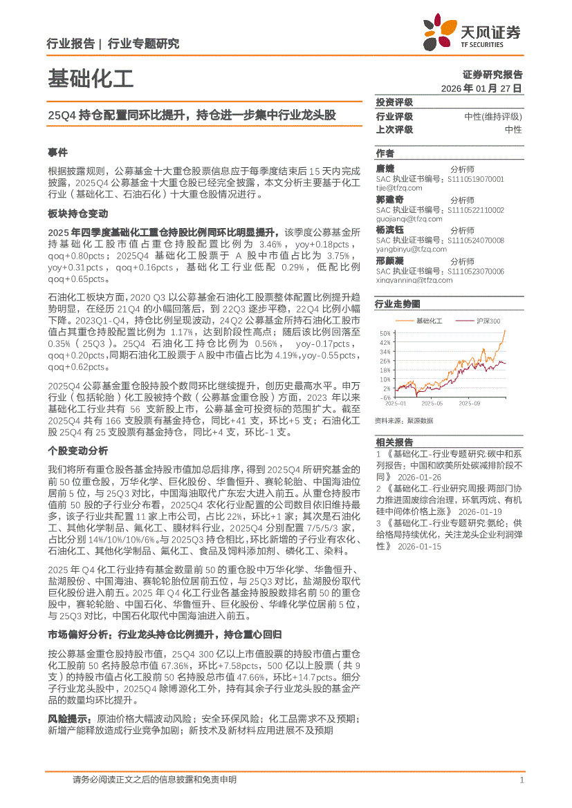 基础化工行业:天风证券-基础化工行业:25Q4持仓配置同环比提升,持仓进一步集中行业龙头股-260127