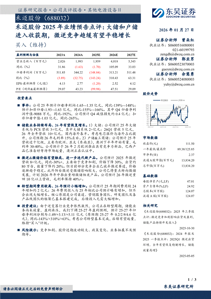 禾迈股份:东吴证券-禾迈股份-688032-2025年业绩预告点评:大储和户储进入收获期,微逆竞争趋缓有望平稳增长-260127
