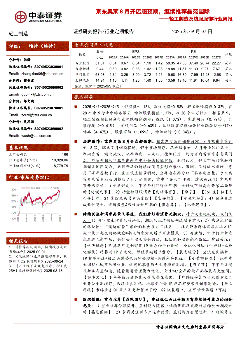 轻工制造及纺服服饰行业:中泰证券-轻工制造及纺服服饰行业周报:京东奥莱8月开店超预期,继续推荐晶苑国际-250907