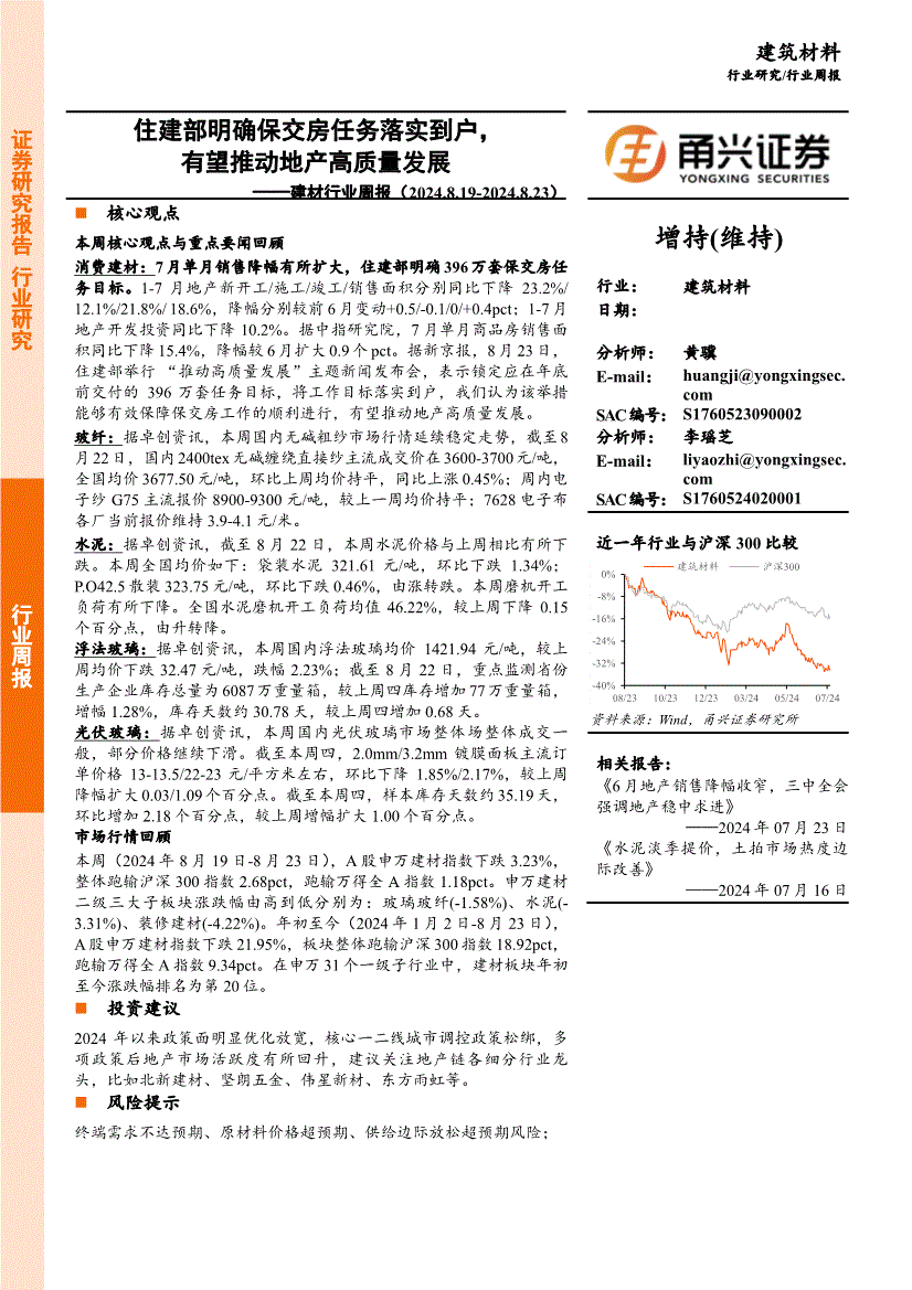 建材行业:甬兴证券-建材行业周报:住建部明确保交房任务落实到户,有望推动地产高质量发展-240819