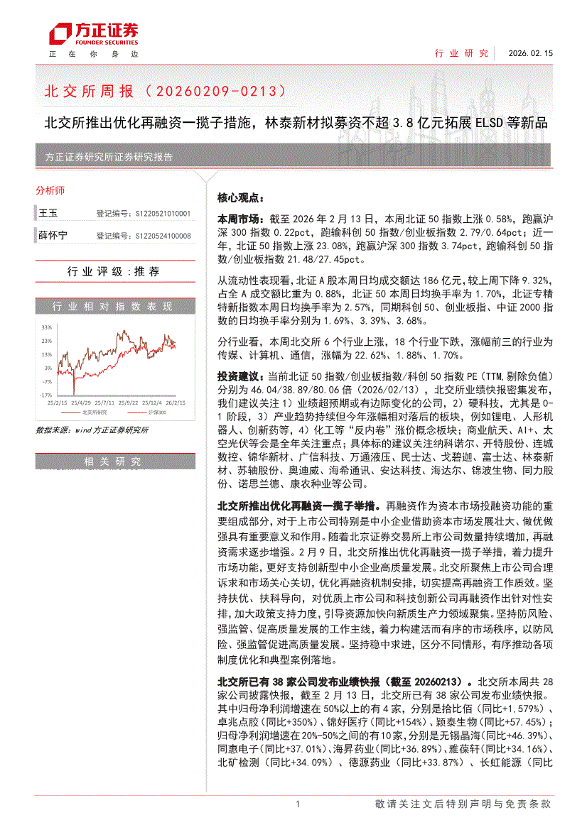 方正证券-北交所周报:北交所推出优化再融资一揽子措施,林泰新材拟募资不超3.8亿元拓展ELSD等新品-260215