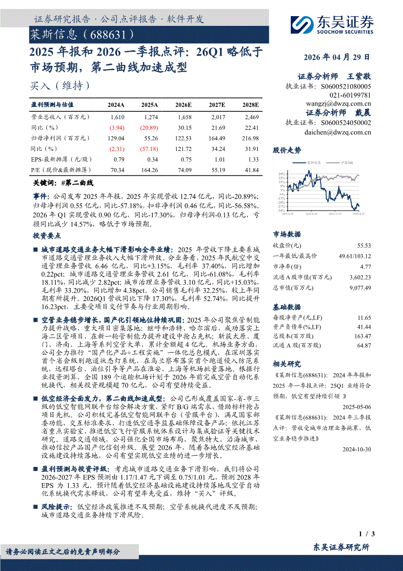 莱斯信息:东吴证券-莱斯信息-688631-2025年报和2026一季报点评:26Q1略低于市场预期,第二曲线加速成型-260429