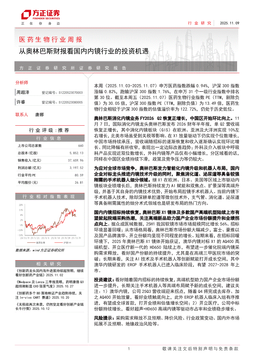 医药生物行业:方正证券-医药生物行业周报:从奥林巴斯财报看国内内镜行业的投资机遇-251109