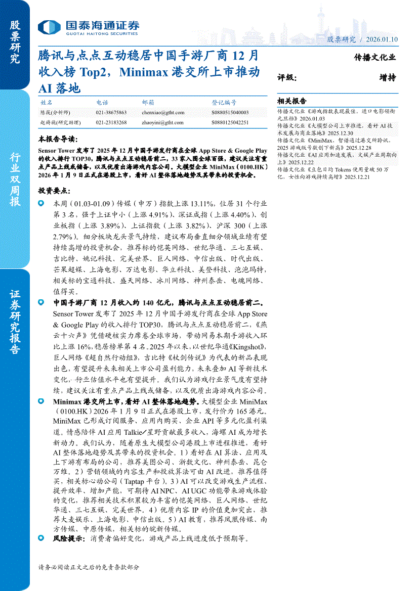 国泰海通证券-传播文化行业:腾讯与点点互动稳居中国手游厂商12月收入榜Top2,Minimax港交所上市推动AI落地-260110