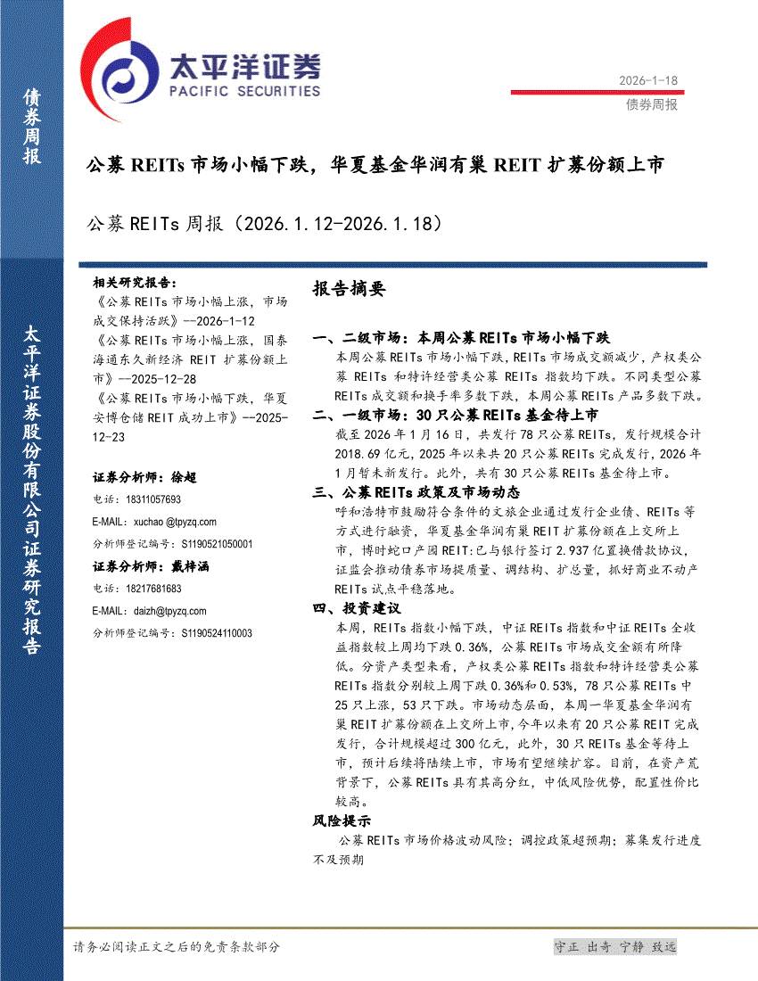 太平洋证券-公募REITs周报:公募REITs市场小幅下跌,华夏基金华润有巢REIT扩募份额上市-260118