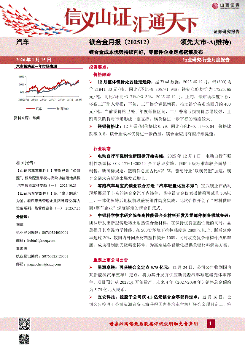 汽车行业:山西证券-汽车行业镁合金月报:镁合金成本优势持续向好,零部件企业定点密集发布-260115
