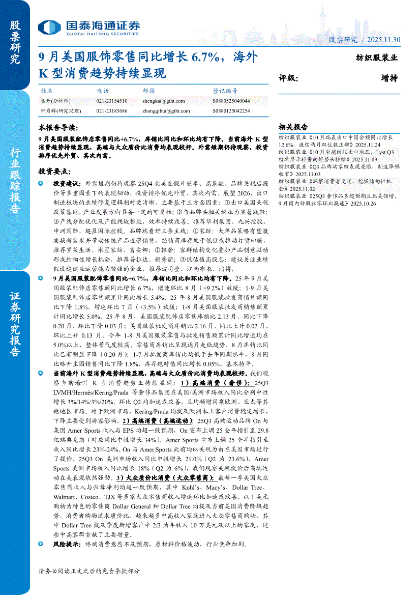 纺织服装行业:国泰海通证券-纺织服装行业:9月美国服饰零售同比增长6.7%,海外K型消费趋势持续显现-251130